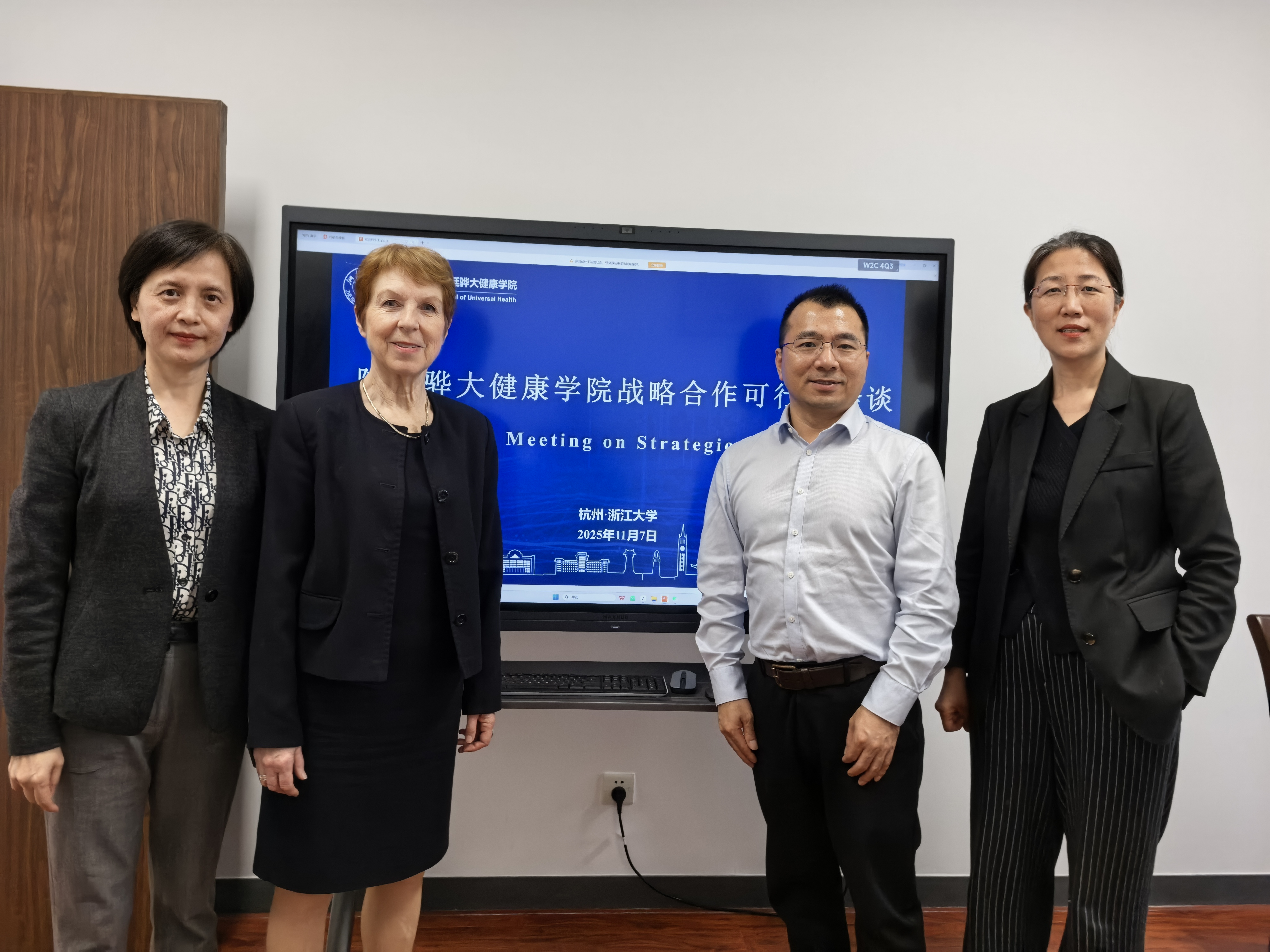 11月7日下午2点,陈廷骅大健康学院执行院长陈光弟、教学副院长叶志弘、行政副院长崔晓红与Susan Michie教授进行了战略合作可行性会谈,讨论了共建课程体系、科研合作、学生国际交流、学术人才交流等方面的合作意向。
