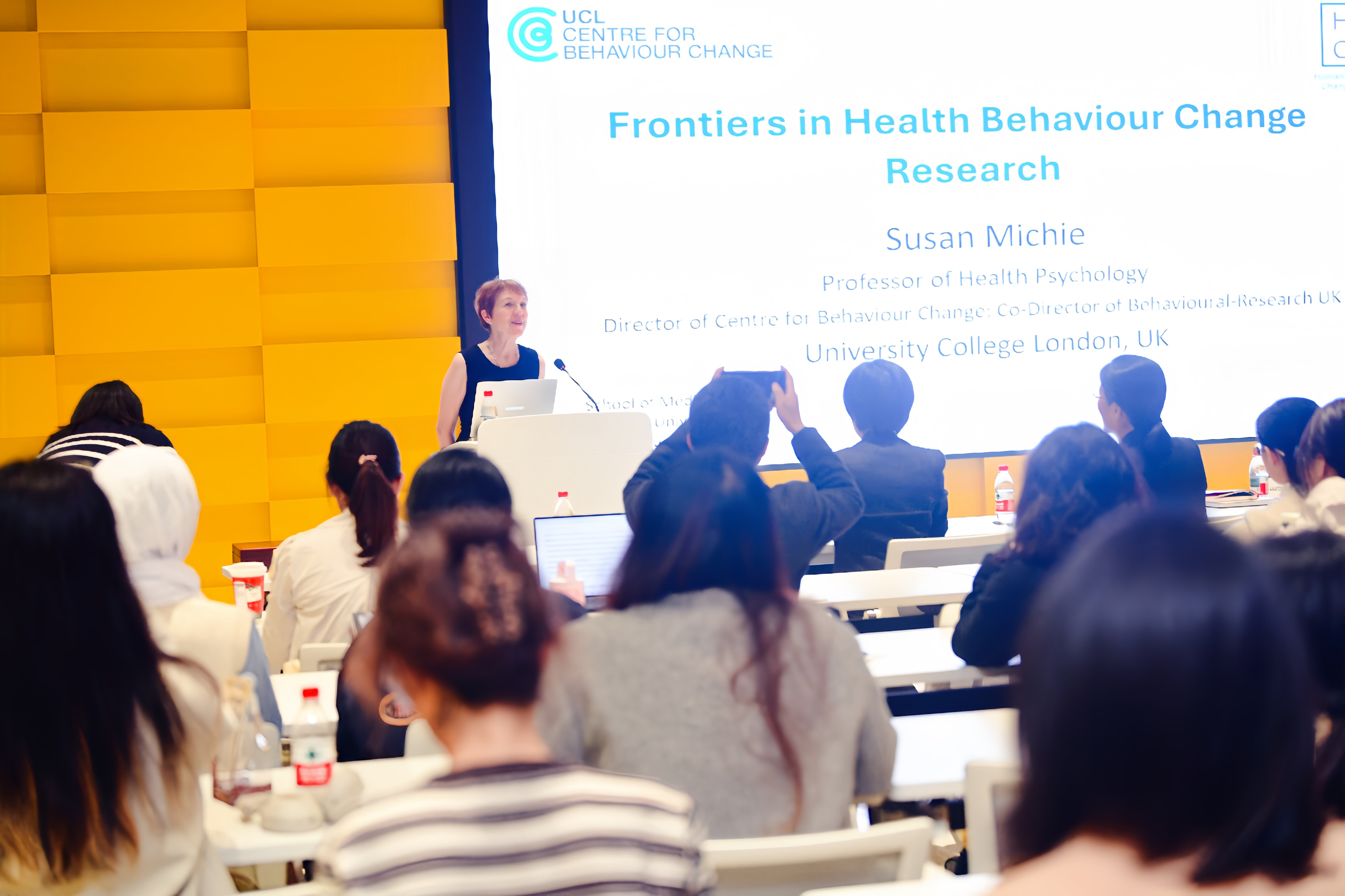 讲座伊始,Michie教授以“行为是健康的核心变量”破题,指出公共卫生、气候变化等全球挑战的解决,亟需超越碎片化的经验干预,转向理论驱动的系统化设计。她深入浅出地解析了其团队开发的COM-B模型(能力、机会、动机→行为)与行为改变轮(BCW)框架,强调“唯有清晰定义行为背后的机制,干预才能可复制、可累积”。这一框架已成为全球健康项目设计的核心工具,从戒烟、疫苗接种到低碳行为推广,均展现出强大的结构化赋能作用。作为关注健康促进的研究者,大家深刻意识到自己在设计干预方案时常常陷入“经验直觉”的局限。COM-B模型让大家重新审视行为背后的多维动因,也启发在场的每个人在未来课题中更注重机制的可解释性与系统整合。